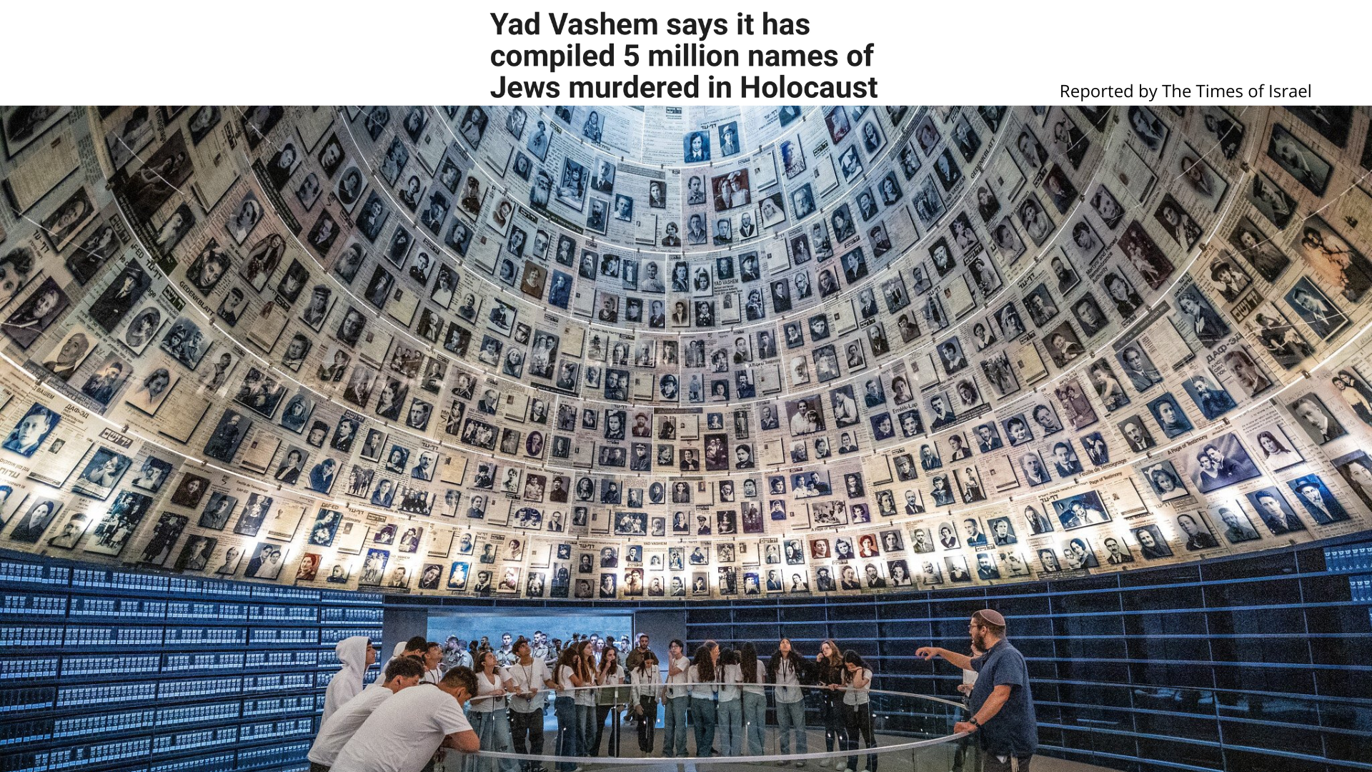 1. Yad Vashem says it has compiled 5 million names of Jews murdered in Holocaust. Milestone achieved with the help of survivors and relatives worldwide; most of the remaining million names will likely never be found, the Holocaust memorial center says. Read the story from The Times of Israel: Yad Vashem says it has compiled 5 million names of Jews murdered in Holocaust | The Times of Israel